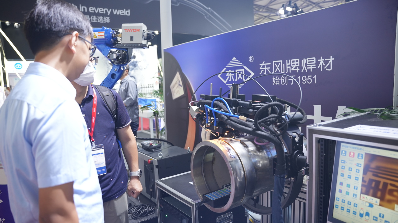 此次機器人展區特別展出了公司為中核集團提供的焊接電源、東風牌配套焊材,以及中核集團自主創新研發了窄間隙TIG焊接機器人,先后攻破20余項技術難點、融入遠程實時控制、工藝數據處理、焊接熔池視覺傳感、機器人姿態方位傳感、語言識別、智能物聯等智能技術,解決了以往管道焊接依賴進口設備的局面,提升了窄間隙焊接自動化水平,并成功在中核石化項目、核電管道安裝等工程得到了廣泛的應用。